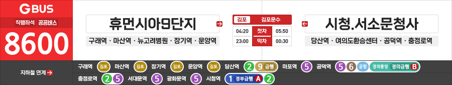 김포/서울시 직행좌석버스 김포운수 8600번 (휴먼시아9단지.구래역.마산역 ↔ 충정로역.시청.서소문청사)