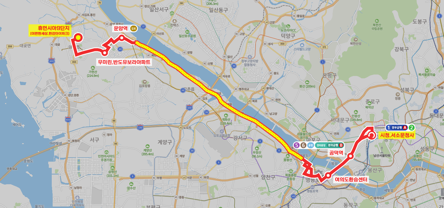 ◼ 상세 경유지 : 휴먼시아9단지이편한세상.한강아이파크 ↔ 한가람마을우미린.호수이편한세상 ↔ 구래역 ↔ 솔터마을입구 ↔ 힐스테이트.경남아너스빌 ↔ 마산역 ↔ 뉴고려병원.이니스더원 ↔ 우미린.반도유보라아파트 ↔ 장기역.주공아파트상 | 장기역.신영아파트하 ↔ 장기역.김포고용복지플러스센터 ↔ 은혜와진리교회상 ↔ 청송2.3단지 ↔ 청송1단지.중흥S클래스 ↔ 반도유보라2차 ↔ 운양역 ↔ 하늘빛마을 ↔ 한신더휴테라스 ↔ 고속도로 무정차 ↔ 당산역 ↔ 여의도환승센터 ↔ 마포역(중) ↔ 공덕역(중) ↔ 충정로역(중)상 | 충정로역2호선하 ↔ (서대문역사거리(중) → 서울역사박물관.경희궁앞(중) → 광화문 → 시청.서소문청사⟲) 이하 역순