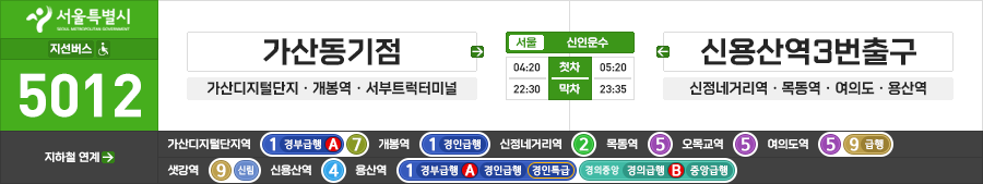서울특별시 지선버스 신인운수 5012번 (가산동기점.가산디지털단지역 ↔ 용산역.신용산역3번출구)