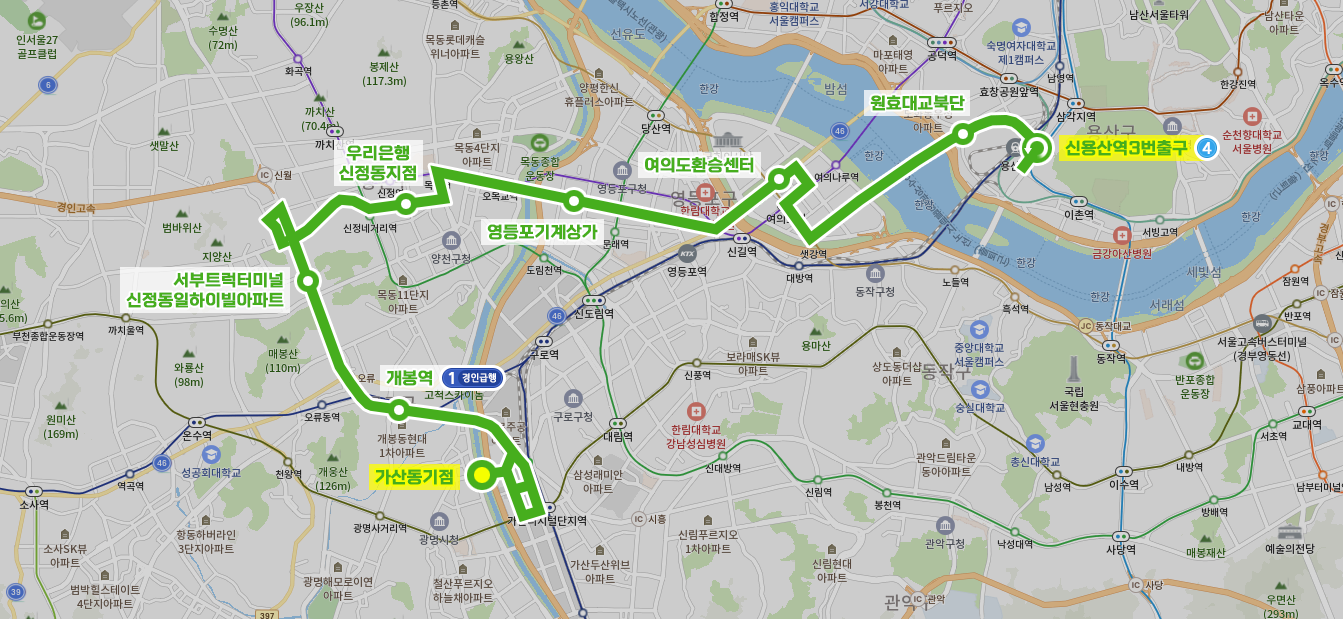→ 신용산역 ▷ 가산동 방면만 신월시영아파트중문 정류장을 경유하오니, 이 점 참고하시기 바랍니다.