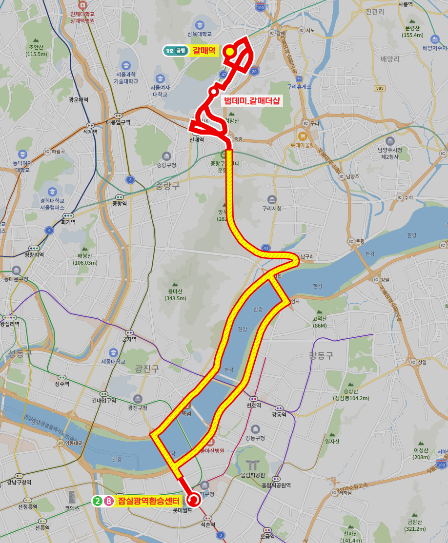 ◼ 상세 경유지 : 갈매역 ↔ 상LH갈매사업단.아이파크상가앞 → 갈매1.2단지.이스트힐정문 → 갈매2단지.이스트힐후문 → 산마루초교.갈매1단지 → 갈매중학교 | 하LH갈매사업단 → 갈매1.2단지.이스트힐정문 → 한라비발디후문 → 담터 ↔ 갈매중앙사거리.단독2단지앞 ↔ 갈매와이시티.갈매초교 ↔ 갈매순환삼거리.갈매6단지.푸르지오정문 ↔ 갈매더샵아파트.갈매6단지 ↔ 범데미.갈매더샵 ↔ 보현사하 ↔ 상우디안아파트114동앞 → 새솔초등학교 → 신내데시앙포레아파트222동앞 → 신내데시앙포레아파트220동앞 → 당너머 → 중랑공영차고지 → 신내능마을 | 하중랑경찰서후문 ↔ 고속도로 무정차 ↔ 잠실광역환승센터⟲ 이하 역순