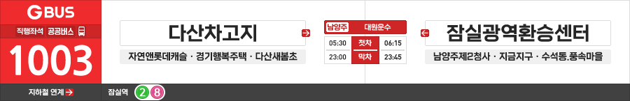 ◼ 막차 : 다산차고지 - 23:00 | 잠실광역환승센터 - 23:45