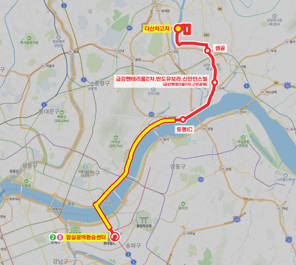 → 잠실광역환승센터에서 탑승하실 때에는 다산 방면 2번 정류소에서 이용하시기 바랍니다.