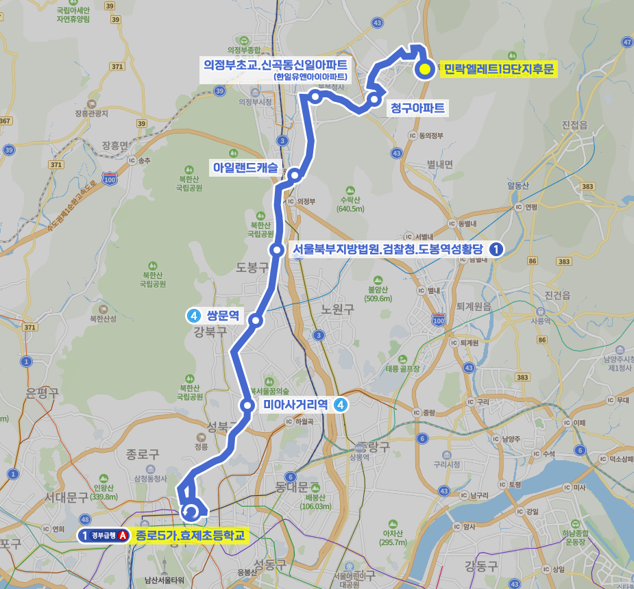 ◼ 상세 경유지 : 민락엘레트19단지후문 ↔ 무지랭이약수터.코스트코 ↔ 용암마을16단지.민락라디언트캐슬상 | 민락센트럴아파트.용암마을15단지하 ↔ 양지마을후문입구상 | 용암마을입구하 ↔ 송양초.민락센트럴17단지.송산3동행정복지센터 ↔ 양지마을8단지.민락푸르지오아파트 ↔ 송양고등학교.호반베르디움2차아파트앞 ↔ 송양중학교.반도유보라아이비파크 ↔ 의정부민락BRT정류소앞상 | BRT.반도유보라아이비파크후문하 ↔ 금강펜테리움.단독주택단지상 | 부용마을3단지.단독주택단지하 ↔ 낙양물사랑공원앞 ↔ 송현고등학교.장애인종합복지관 ↔ 산들마을1단지남문 ↔ 민락주공2단지 ↔ 청구아파트 ↔ 송산주공4단지상 ↔ 송산1동주민센터 ↔ 만가대.솔뫼중학교 ↔ 구306보충대.탑석센트럴자이아파트 ↔ 세아.보광.건영아파트앞 ↔ 동국대사범부속영석고등학교 ↔ 신곡현대아파트 ↔ e편한세상신곡파크비스타 ↔ 의정부초교.신곡동신일아파트상 | 한일유앤아이아파트하 ↔ 의정부초등학교하 ↔ 신곡지하차도 ↔ 신곡주택.의암교회 ↔ 서해.한일.삼익아파트 ↔ 장암주공5단지.한국.풍림아파트 ↔ 장암주공2단지.장암우성아파트 ↔ 쌍암사입구 ↔ 아일랜드캐슬 ↔ 도봉차량기지앞 ↔ 다락원.서울도솔학교앞 ↔ 도봉산역 ↔ 도봉한신아파트 ↔ 서울북부지방법원.검찰청.도봉역성황당 ↔ 신도봉사거리 ↔ 신도봉시장.도봉구청.방학북부역 ↔ 도봉소방서.방학남부역 ↔ 도봉보건소.북한산아이파크아파트 ↔ 도봉구민회관.도봉문화원 ↔ 쌍문역 ↔ 우이1교앞 ↔ 수유3동우체국 ↔ 수유(강북구청)역 ↔ 수유역상 ↔ 수유시장.성신여대미아캠퍼스앞 ↔ 미아역.신일중고 ↔ 도봉세무서.성북시장 ↔ 미아사거리역 ↔ 월곡뉴타운 ↔ 길음뉴타운 ↔ 미아리고개.미아리예술극장 ↔ 돈암사거리.성신여대입구 ↔ 삼선교.한성대학교.조소앙활동터 ↔ (혜화동로터리.여운형활동터 → 명륜3가.성대입구 → 창경궁.서울대학교병원 → 현대그룹빌딩 → 이화동(이화장) → 충신동 → 동대문 → 종로5가.효제중학교⟲ → 종로5가.효제동.김상옥의거터 → 방송통신대.이화장 → 혜화역.마로니에공원 → 혜화역.동성중고(장면총리가옥)) 이하 역순