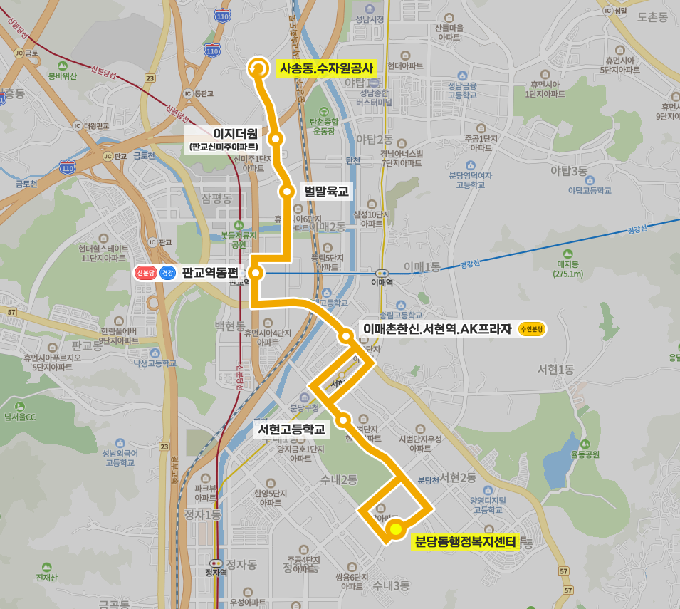 ◼ 상세 경유지 : (효자촌사거리 → 동성아파트상가 → 샛별마을동성아파트 → 분당동행정복지센터 → 샛별마을삼부아파트 → 수내중학교 → 우방아파트 → 샛별마을.우방아파트) ↔ 현대시범아파트상 | 중앙공원하 ↔ 서현고등학교 ↔ 상서현역.AK플라자 → 서현역.AK플라자 → 분당구청.서현역 → 서현역.분당우체국 | 하이매촌한신.서현역.AK프라자 → 서현역.서현고가차도 ↔ 서현역.AK플라자 ↔ 서현역.AK플라자 ↔ 분당구청.서현역 ↔ 서현역.분당우체국 ↔ 이매촌한신.서현역.AK프라자 ↔ 백현마을2단지상 | 백현마을3단지하 ↔ 백현마을1단지상 | 백현마을4단지하 ↔ 판교역동편 ↔ 봇들마을7.8단지.롯데마트판교점 ↔ 보평초.중고상 ↔ 봇들마을9단지상 | 봇들마을7단지하 ↔ 벌말육교 ↔ 판교고교.송현초교 ↔ 이지더원상 | 판교신미주아파트하 ↔ 사송동자동차검사소 ↔ 사송동.수자원공사 이하 역순