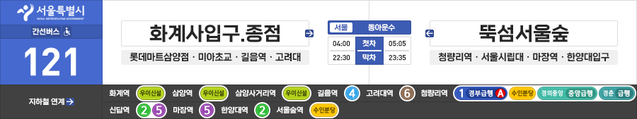 서울특별시 간선버스 동아운수 121번 (화계사입구.종점.삼양초등학교 ↔ 한양대정문.뚝섬서울숲)