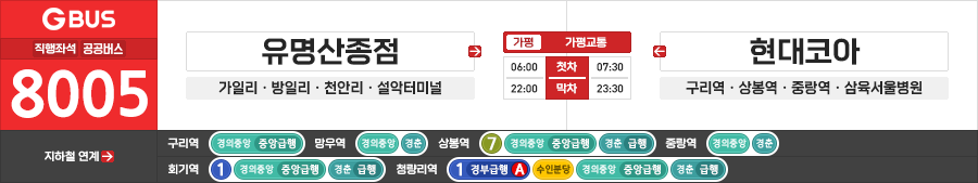가평/구리/서울시 직행좌석버스 가평교통 8005번 (유명산종점.설악터미널 ↔ 삼육서울병원.현대코아.청량리역)