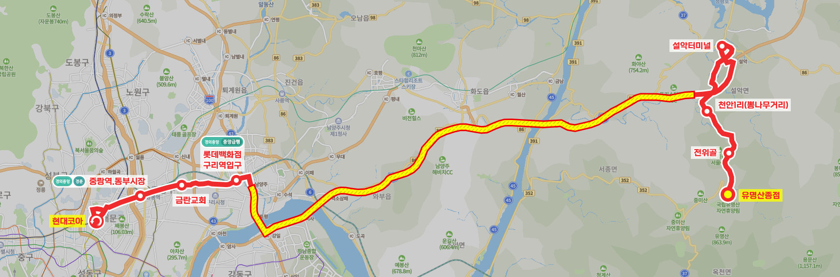 ◼ 상세 경유지 : 유명산종점 ↔ 가일리삼거리 ↔ 가일리하 ↔ 가일1리 ↔ 전위골 ↔ 방일리 ↔ 천안1리뇌암상 | 천안1리하 ↔ 불기마을 ↔ 천안1리상 | 뽕나무거리하 ↔ 한우재 ↔ 숙골 ↔ 신천4리인내상 | 인내하 ↔ 명장삼거리 ↔ 명장부락 ↔ 설악터미널 ↔ 면사무소앞 ↔ 한교막 ↔ 고속도로 무정차 ↔ 롯데백화점.구리역입구(중) ↔ 돌다리.구리전통시장(중) ↔ 한양대구리병원.새마을금고(중) ↔ 교문사거리(중) ↔ 딸기원(중) ↔ 동부제일병원.망우리공원(중) ↔ 금란교회 ↔ 우림시장.망우사거리(중) ↔ 망우역.망우지구대 ↔ 망우역.상봉터미널(중) ↔ 상봉역.중랑우체국(중) ↔ 중랑역.동부시장(중) ↔ 중랑교(중) ↔ 삼육서울병원(중) ↔ (시조사삼거리(중) → 청량리한신아파트 → 현대코아 → 청량리역환승센터) 이하 역순