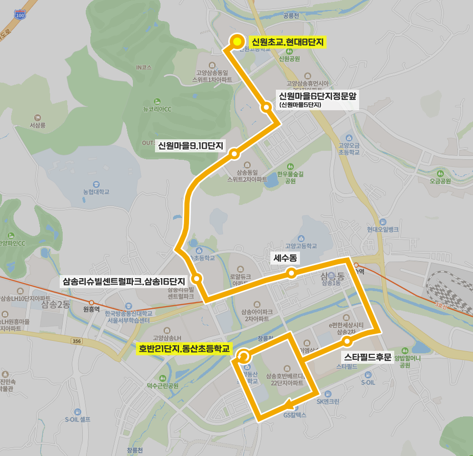 ◼ 상세 경유지 : 신원초교.현대8단지 ↔ 신원도서관 ↔ 신원마을5단지상 | 신원마을4단지하 ↔ 신원마을6단지정문앞상 | 신원마을5단지하 ↔ 신원마을6단지 ↔ 신원마을9.10단지 ↔ 삼송리슈빌센트럴파크.삼송16단지 ↔ 우리은행앞상 | 삼송마을1602동앞하 ↔ 삼송마을20단지상 | 삼송마을16.17단지하 ↔ 세수동 ↔ 삼송역3번출구상 | 삼송역5번출구하 ↔ 농협하나로클럽 ↔ 스타필드후문 ↔ 호반22단지정문 ↔ (동산마을22단지 → 고양동산초등학교.창릉동행정복지센터 → 호반21단지.동산초등학교⟲ → 호반22단지후문) 이하 역순