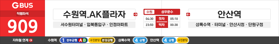 수원/안산시 직행좌석버스 성우운수 909번 (수원역.AK플라자.서수원터미널 ↔ 안산시청.시민시장.안산역)