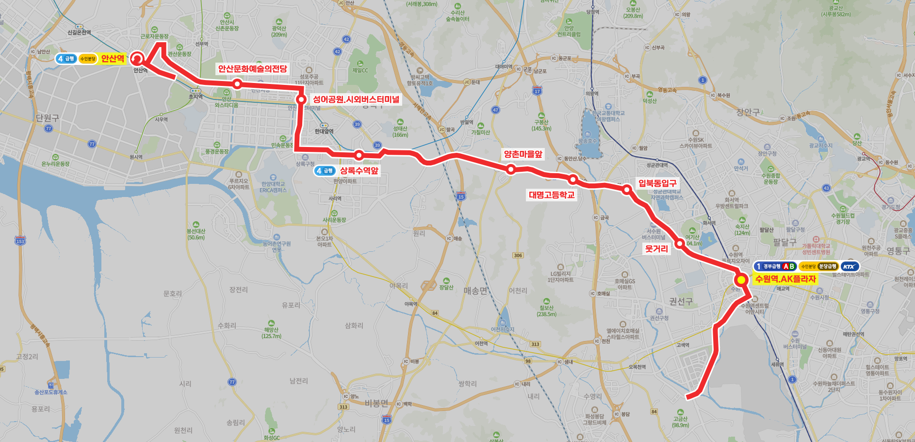 → 수원역에서 탑승하실 때에는 안산역 방면 북측 원형 정류소에서 이용하시기 바랍니다.