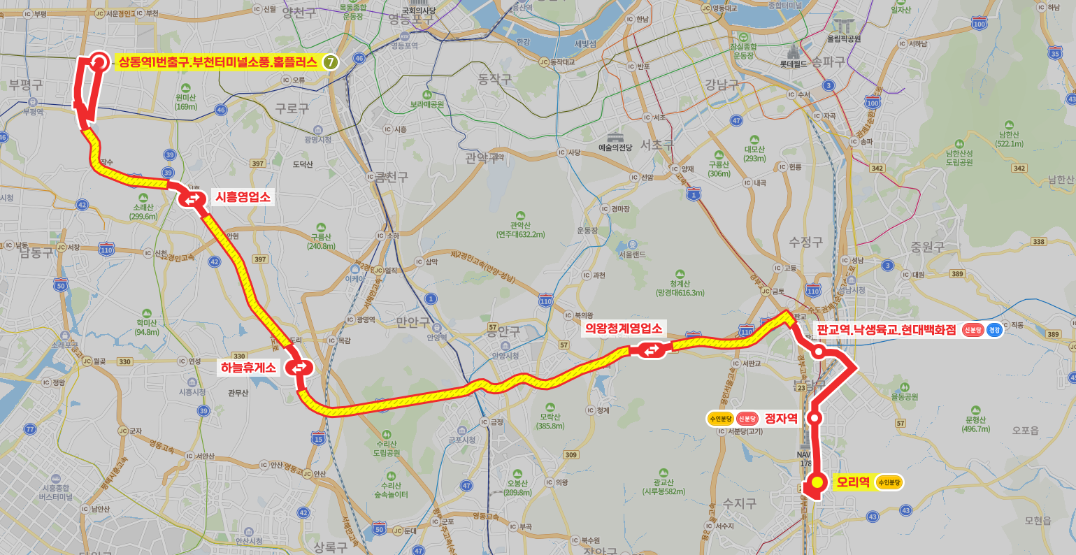 ◼ 상세 경유지 : 오리역 ↔ 미금역.청솔마을.2001아울렛 ↔ 정자역 ↔ 롯데백화점.수내역 ↔ 이매촌한신.서현역.AK프라자 ↔ 판교역.낙생육교.현대백화점 ↔ 고속도로 무정차 ↔ 의왕청계영업소 ↔ 고속도로 무정차 ↔ 하늘휴게소 ↔ 고속도로 무정차 ↔ 시흥영업소 ↔ 고속도로 무정차 ↔ (상동역1번출구.부천터미널소풍.홈플러스⟲ → 부천터미널소풍 → 하얀마을 → 복사골문화센터.한아름마을 → 반달마을.법원.검찰청 → 송내역남부(광역버스)) 이하 역순