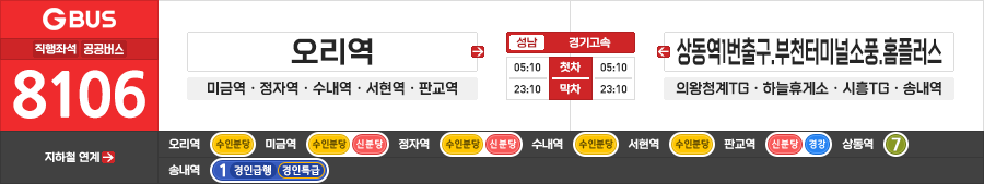 성남/의왕/시흥/부천시 직행좌석버스 경기고속 8106번 (오리역.미금역 ↔ 상동역1번출구.부천터미널소풍)