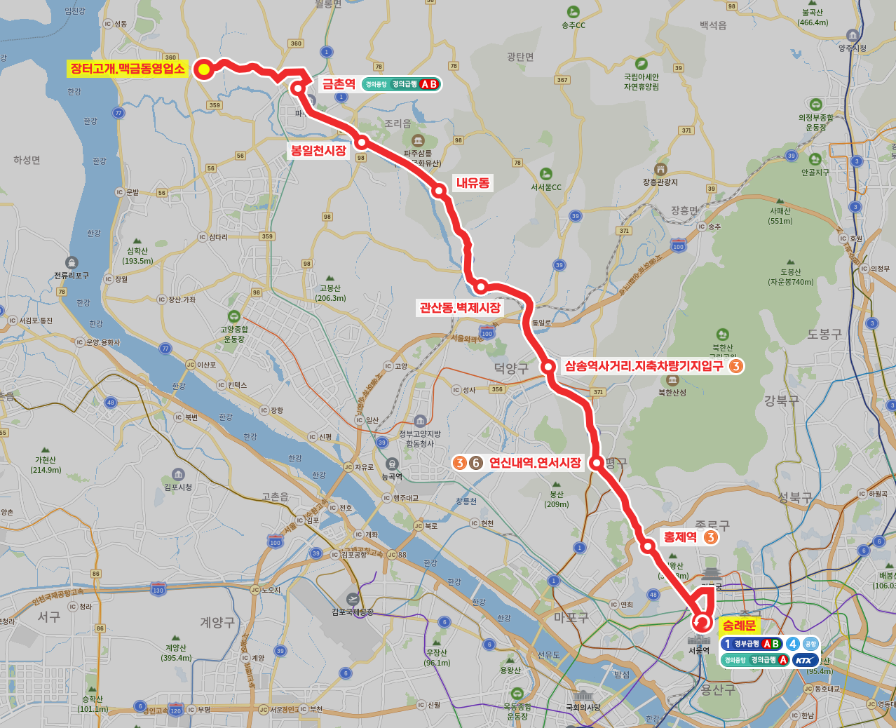 ◼ 상세 경유지 : 장터고개.맥금동영업소 ↔ 배무기 ↔ 검산초등학교 ↔ 유승아파트 ↔ 성원아파트 ↔ 대방아파트 ↔ 풀무골상 | 야동동하 ↔ 문산제일고정문하 ↔ 문산제일고 ↔ 문산제일고삼거리상 ↔ 독점말.대방노블랜드2차아파트 ↔ 팜스프링아파트 ↔ 금촌농협상 | 금촌1동하 ↔ 금촌역 ↔ 금촌사거리 ↔ 장안아파트 ↔ 파주시청 ↔ 교육지원청 ↔ 흰돌아파트 ↔ 파주스타디움 ↔ 대창리 ↔ 말레이지아교 ↔ 조리읍행정복지센터 ↔ 봉일천시장 ↔ 조리농협삼일운동기념비 ↔ 봉일천4리 ↔ 파주삼릉 ↔ 송촌토파즈아파트상 ↔ 농협하나로클럽 ↔ 장곡검문소.통일로장곡아울렛매장 ↔ 내유동 ↔ 중간내유동 ↔ 윗내유동.희망양로원 ↔ 내유초등학교 ↔ 서울시립고양병원입구 ↔ 고골입구 ↔ 가장동 ↔ 두포동.관산동성당 ↔ 관산삼거리 ↔ 고양외고.고양제일중학교 ↔ 관산주공아파트.관산동행정복지센터 ↔ 관산동.벽제시장 ↔ 더퍼스트프라임하 ↔ 신성아파트상 | 새서울아파트하 ↔ 필리핀참전비 ↔ 대자동 ↔ 서울시립승화원 ↔ 세원마을입구 ↔ 신원마을1단지.신원중 ↔ 신원마을2.4단지 ↔ 신원마을3단지 ↔ 삼송주택앞 ↔ 삼송역사거리.지축차량기지입구 ↔ 은평뉴타운10단지(중) ↔ 구파발역입구(중) ↔ 박석고개.신도고등학교(중) ↔ 세명컴퓨터고등학교(중) ↔ 연신내역.연서시장(중) ↔ 동명여고.천주교불광동성당(중) ↔ 불광역3.6호선(중) ↔ 불광역3호선.서울혁신파크(중) ↔ 한전성서지사.녹번동푸르지오하 ↔ 녹번역(중) ↔ 산골고개(중) ↔ 홍제역(중) ↔ 홍제삼거리.인왕산한신휴플러스(중)상 | 인왕산.홍제원아파트(중)하 ↔ 무악재역(중) ↔ 안산초등학교(중)상 ↔ 독립문역.한성과학고(중) ↔ 영천시장(중) ↔ (서울역사박물관.김구집무실(경교장) → 광화문 → 신한은행본점 → 숭례문⟲ → 서대문경찰서.농협은행.유관순활동터) 이하 역순