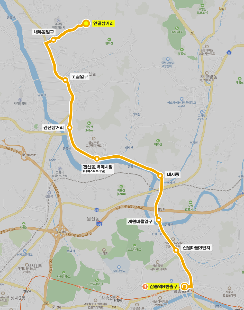 ◼ 상세 경유지 : 안골삼거리 ↔ 다리앞 ↔ 새벽교회 ↔ 금강슈퍼 ↔ 늘사랑요양원 ↔ 희망양로원 ↔ 내유동입구 ↔ 윗내유동.희망양로원 ↔ 내유초등학교 ↔ 서울시립고양병원입구 ↔ 고골입구 ↔ 가장동 ↔ 두포동.관산동성당 ↔ 관산삼거리 ↔ 고양외고.고양제일중학교 ↔ 관산주공아파트.관산동행정복지센터 ↔ 관산동.벽제시장하 ↔ 관산동.벽제시장상 | 더퍼스트프라임하 ↔ 신성아파트상 | 새서울아파트하 ↔ 필리핀참전비 ↔ 대자동 ↔ 서울시립승화원 ↔ 세원마을입구 ↔ 신원마을1단지.신원중 ↔ 신원마을2.4단지 ↔ 신원마을3단지 ↔ 삼송주택앞 ↔ 삼송역사거리.지축차량기지입구 ↔ 삼송역8번출구⟲ 이하 역순