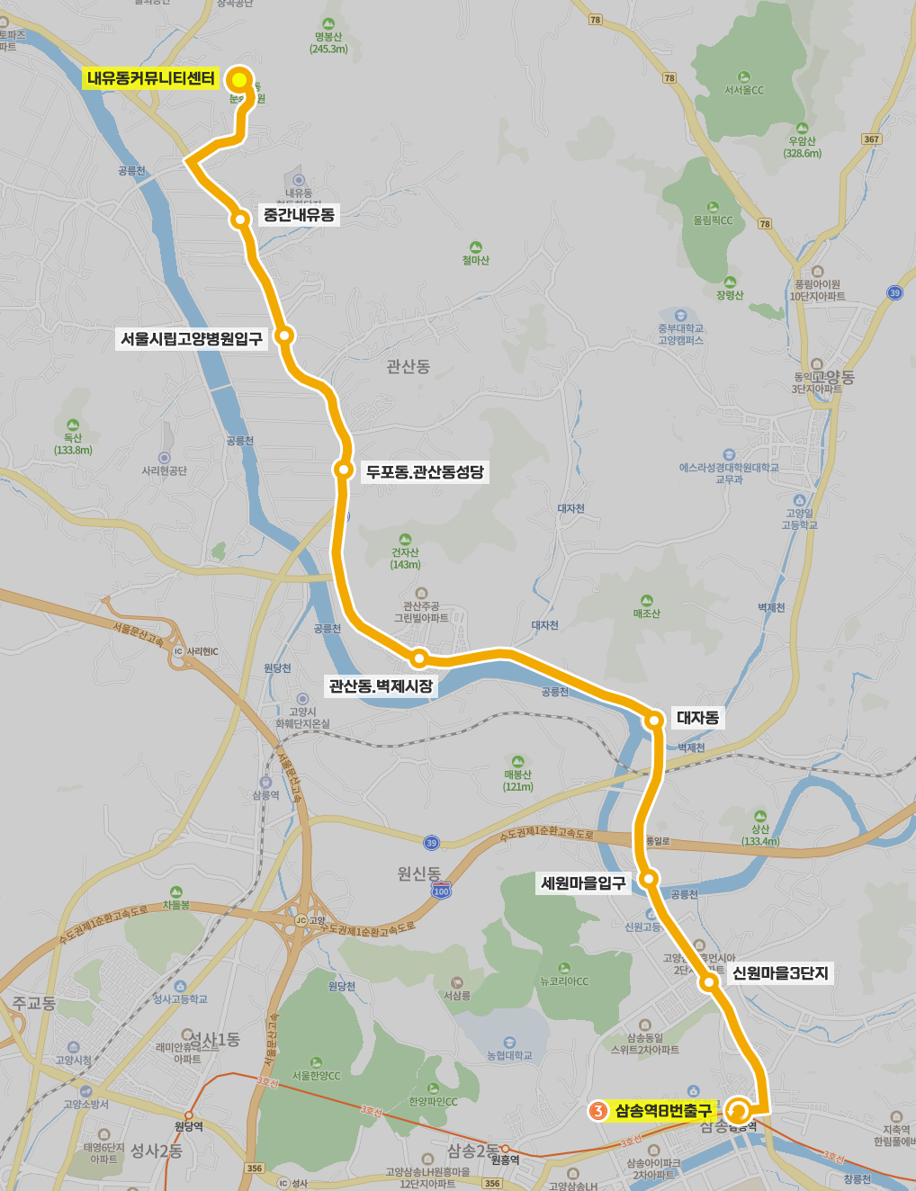 ◼ 상세 경유지 : 내유동커뮤니티센터 ↔ 경찰교육훈련센터 ↔ 킹스빌타운.미성빌라 ↔ 명성운수종점 ↔ 신성슈퍼앞 ↔ 내유동 ↔ 중간내유동 ↔ 윗내유동.희망양로원 ↔ 내유초등학교 ↔ 서울시립고양병원입구 ↔ 고골입구 ↔ 가장동 ↔ 두포동.관산동성당 ↔ 관산삼거리 ↔ 고양외고.고양제일중학교 ↔ 관산주공아파트.관산동행정복지센터 ↔ 관산동.벽제시장하 ↔ 관산동.벽제시장상 | 더퍼스트프라임하 ↔ 신성아파트상 | 새서울아파트하 ↔ 필리핀참전비 ↔ 대자동 ↔ 서울시립승화원 ↔ 세원마을입구 ↔ 신원마을1단지.신원중 ↔ 신원마을2.4단지 ↔ 신원마을3단지 ↔ 삼송주택앞 ↔ 삼송역사거리.지축차량기지입구 ↔ 삼송역8번출구⟲ 이하 역순