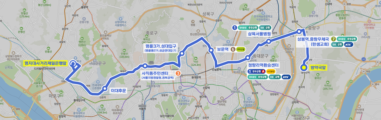 ◼ 상세 경유지 : 방약국앞 ↔ 면남초등학교 ↔ 지하철7호선사가정역상 | 면목시장하 ↔ 지하철7호선사가정역하 ↔ 면목우체국.녹색병원 ↔ 면동초등학교 ↔ 면목본동주민센터.면목정보도서관 ↔ 지하철7호선면목역 ↔ 면목초등학교 ↔ 지하철7호선상봉역 ↔ 상봉역.중랑우체국상 | 한샘교회하 ↔ 중랑역.동부시장 ↔ 중랑교 ↔ 삼육서울병원 ↔ 시조사삼거리상 | 휘경동입구하 ↔ 떡전교사거리.동대문노인복지관상 | 서울성심병원하 ↔ 청량리미주아파트.동대문세무서상 ↔ 청량리역환승센터 ↔ 청량리.청과물도매시장상 | 청량리수산시장하 ↔ 제기동역.서울약령시 ↔ 용두동사거리.한국의류시험연구원 ↔ 신설동역 ↔ 신설동역1번출구상 ↔ 보문동주민센터 ↔ 보문동성당 ↔ 보문역 ↔ 성북구청.성북경찰서 ↔ 삼선동주민센터 ↔ 돈암초교입구하 ↔ 삼선교.한성대학교 ↔ 혜화동로터리.여운형활동터상 ↔ 명륜3가.성대입구상 | 명륜동2가.성균관대입구하 ↔ 창경궁.서울대학교병원 ↔ 창덕궁.서울돈화문국악당상 | 창덕궁.우리소리박물관하 ↔ 안국역.종로경찰서.서울공예박물관 ↔ 덕성여중고상 | 경복궁하 ↔ 사직동주민센터상 | 서울지방경찰청.경복궁역하 ↔ 사직단.어린이도서관 ↔ 이대부고 ↔ 이대부중상 | 이대후문하 ↔ 세브란스병원앞 ↔ 연세대앞 ↔ 서대문우체국 ↔ 연희104고지앞.구성산회관 ↔ 사천교 ↔ 서대문종합사회복지관 ↔ 연가교 ↔ (남가좌현대아파트 → 명지대사거리 → 명지대사거리제일은행앞⟲ → 백련시장 → 홍남교백련시장입구) 이하 역순