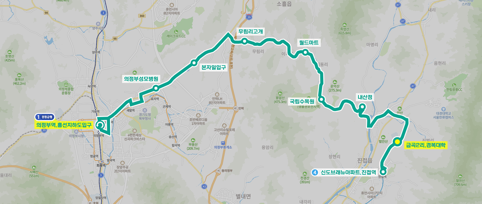 ◼ 첫차 : 금곡2리.경복대학 - 05:00 | 의정부역.흥선지하도입구 - 06:00