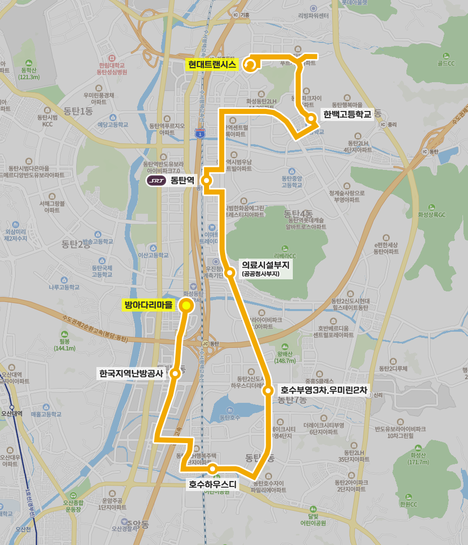 ◼ 상세 경유지 : 방아다리마을 ↔ 방교동 ↔ 한국지역난방공사 ↔ 산척리 ↔ DM디스플레이상 ↔ 행복주택28단지 ↔ 엘크루아파트 ↔ 호수하우스디 ↔ 금호어울림2차 ↔ 호수자이파밀리에.아이원 ↔ 금호어울림.계룡리슈빌 ↔ 동탄호수공원.부영4차 ↔ 호수부영3차.우미린2차 ↔ 나래학교.더샵레이크상 | 레이크빌.하우스디더레이크하 ↔ 반도3차.금강1차 ↔ 의료시설부지상 | 공공청사부지하 ↔ 리베라CC ↔ 한화.린스트라우스 ↔ 동탄역 ↔ 우남퍼스트빌.예미지시그너스 ↔ 상록.테크노밸리.GS자이 ↔ 센트럴상록.동원1차상 ↔ 동탄2파출소.농협 ↔ 퍼스트파크.이지더원 ↔ 상록.경남아파트.이주택지 ↔ 한백고등학교 ↔ 동탄파크자이.이지더원후문 ↔ 동탄파크자이정문 ↔ 다원초.파크자이 ↔ (파크푸르지오 → LH1단지.한양수자인 → LH1단지.한양수자인 → 파크푸르지오) ↔ 늘봄초교.파크푸르지오상 | 늘봄초교.중흥더테라스하 ↔ 현대트랜시스.동원4차 ↔ 현대트랜시스⟲ 이하 역순