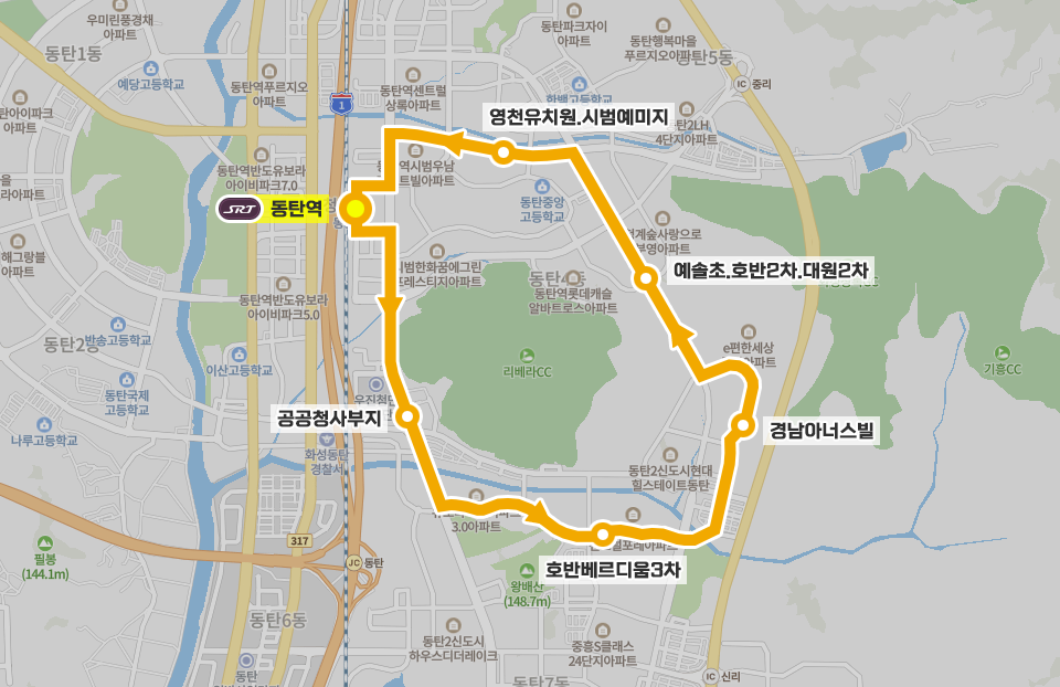 → 동탄역 ▷ 리베라CC ▷ 호반3차 ▷ 신리입구 ▷ 경남아너스빌 ▷ 목동초 ▷ 예솔초 ▷ 반도4차 ▷ 영천초 ▷ 동탄역 순으로 단방향 운행합니다.