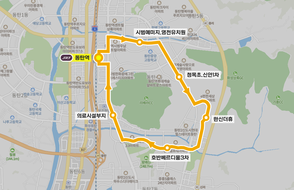 → 동탄역 ▷ 영천초 ▷ 반도4차 ▷ 청목초 ▷ 목동중 ▷ 한신더휴 ▷ 신리입구 ▷ 호반3차 ▷ 리베라CC ▷ 동탄역 순으로 단방향 운행합니다.