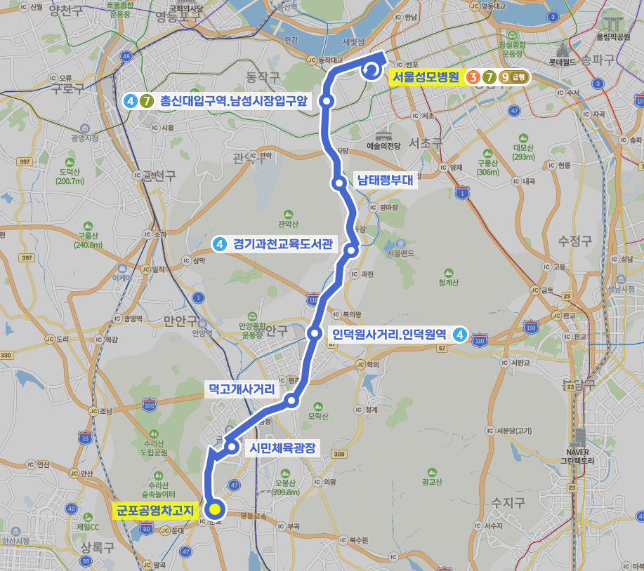 ◼ 상세 경유지 : 군포공영차고지 ↔ 군포보건소 ↔ 수리산역.5단지 ↔ 군포소방서상 | 5단지아파트입구하 ↔ 오금동행정복지센터상 | 흥진고등학교하 ↔ 3단지.소월아파트.다산아파트상 | 3단지.율곡아파트하 ↔ 시민체육광장 ↔ 주공1단지.무궁화아파트상 | 충무주공아파트하 ↔ 군포경찰서하 ↔ 군포경찰서상 | 느티울공원입구하 ↔ 신환아파트 ↔ 금정고가금정농협상 | 산본주유소하 ↔ 삼신아파트 ↔ 서안이노빌아파트상 | 평촌어바인퍼스트아파트.홈플러스하 ↔ 호계사거리 ↔ 호계소방파출소 ↔ 덕고개사거리 ↔ 샘마을.대안중학교 ↔ 안양남초등학교 ↔ 농수산물시장.포일단지입구 ↔ 민백마을 ↔ 나눔초등학교.오뚜기식품.두산벤처다임 ↔ 평촌동행정복지센터.KT동안양지점.인덕원대우아파트 ↔ 인덕원초교.삼성아파트상 ↔ 인덕원사거리.인덕원역 ↔ 린파밀리에 ↔ 과천푸르지오라비엔오상 | 과천지식정보타운하 ↔ 찬우물 ↔ 정보과학도서관상 ↔ 과천위버필드.래미안슈르상 | 수자원공사.센트레빌아스테리움하 ↔ 정부과천청사역2번출구상 | 정부과천청사역3번출구하 ↔ 과천중앙공원.KT과천지사상 | 정부과천청사역11번출구.KT과천지사하 ↔ 경기과천교육도서관.과천역6출구상 | 경기과천교육도서관.과천역7출구하 ↔ 과천주공8.9단지상 | 과천주공10단지하 ↔ 관문체육공원.과천성당 ↔ 과천동주민센터 ↔ 남태령고개 ↔ 남태령역 ↔ 사당자동차학원하 ↔ 사당역 ↔ 방배노인종합복지관하 ↔ 이수역상 | 사당동우체국앞하 ↔ 총신대입구역.남성시장입구앞 ↔ 경문고교.배나무골앞 ↔ 정금마을.방배경찰서 ↔ 이수교상 | 갯마을앞하 ↔ 구반포역.세화고등학교 ↔ 신반포역.세화여중고 ↔ 고속터미널 ↔ 서울성모병원⟲ 이하 역순
