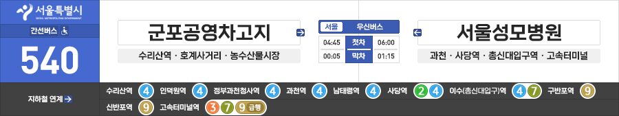 군포/안양/과천/서울시 간선버스 우신버스 540번 (군포공영차고지.수리산역 ↔ 고속터미널.서울성모병원)