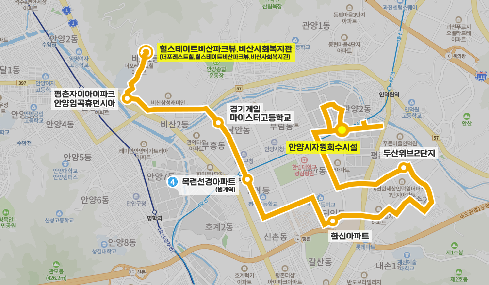 ◼ 상세 경유지 : 대륭테크노타운안양시자원회수시설 ↔ 하평촌스마트스퀘어 → 휴비츠.뷰웍스 → 스마트베이 ↔ 평촌역 ↔ 초원부영아파트상 | GS파워하 ↔ 동안고등학교정문상 | 초원한양아파트하 ↔ 초원대원아파트상 | 초원럭키아파트하 ↔ 꿈마을우성아파트상 | 새중앙교회하 ↔ 농협삼거리.우미린아파트 ↔ 국민은행 ↔ 두산위브2단지 ↔ 내손이편한세상1단지상 ↔ 내손초등학교 ↔ 백운고교 ↔ 포일성당상 | 포일운동장앞하 ↔ 등대교회상 | 내손다구역현장하 ↔ 어린이공원 ↔ 인덕원센트럴자이아파트사거리 ↔ 인덕원센트럴자이아파트 ↔ 농수산물도매시장 ↔ 한신아파트 ↔ 귀인중학교 ↔ 향촌현대아파트 ↔ 목련우성아파트상 | 무궁화금호아파트하 ↔ 범계중학교 ↔ 평촌고등학교상 | 목련신동아아파트하 ↔ 목련선경아파트상 | 범계역(중)하 ↔ 동안구청.달안초등학교.홈플러스 ↔ 샛별한양아파트.한양스포츠센터 ↔ 경기게임마이스터고등학교 ↔ 동양월드타워상 ↔ 대림아파트상 | 미륭아파트하 ↔ 삼성래미안아파트상 | 비산롯데캐슬.평촌래미안푸르지오하 ↔ 비산사거리.이마트 ↔ 비산1동행정복지센터 ↔ 평촌자이아이파크.안양임곡휴먼시아 ↔ 대림대학교 ↔ 평촌자이아이파크3문.양성교회상 ↔ 더포레스트힐 ↔ 더포레스트힐.힐스테이트비산파크뷰.비산사회복지관하 ↔ 힐스테이트비산파크뷰.비산사회복지관⟲ 이하 역순