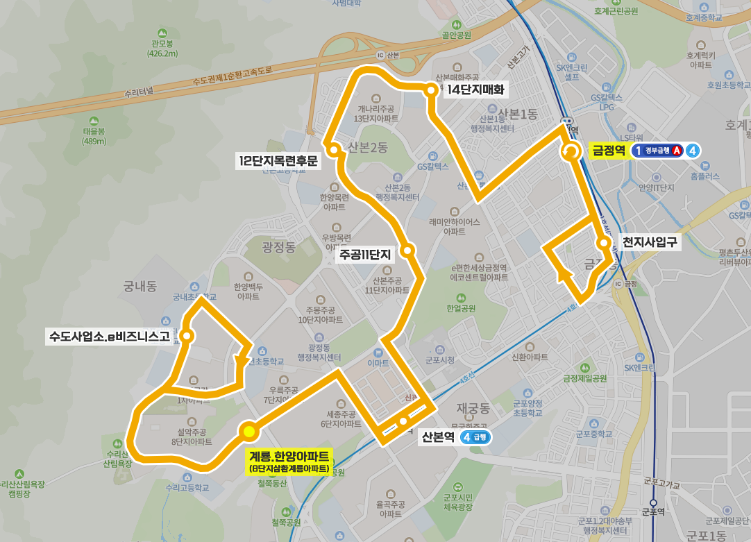 → 계룡.한양아파트 ▷ 금정역 방면만 수리동행정복지센터 ~ 롯데.동성아파트 정류장을 경유하오니, 이 점 참고하시기 바랍니다.