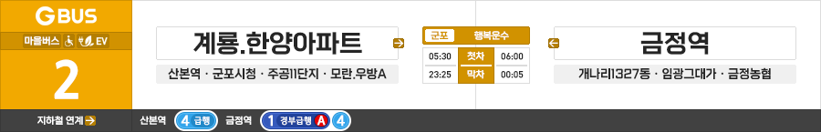 군포시 일반시내버스 행복운수 2번 (계룡.한양아파트.산본역 ↔ 임광그대가.금정역)
