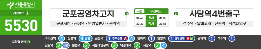 군포/안양/서울시 지선버스 우신버스 5530번 (군포공영차고지.수리산역 ↔ 낙성대입구.사당역4번출구)