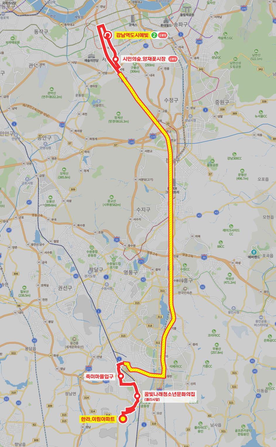 ◼ 상세 경유지 : 한라.이림아파트 ↔ 늘푸른아파트.오산초등학교 ↔ 가수동주공아파트 ↔ 남촌오거리.세교2지구12단지 ↔ 오산대학 ↔ 꿈빛나래청소년문화의집상 | 궐리사앞하 ↔ 궐리사.대우아파트 ↔ 대우아파트 ↔ 오산대역.물향기수목원 ↔ 수청초등학교앞 ↔ 금암마을7단지상 | 세교데시앙포레하 ↔ 금암마을3.4.5단지 ↔ 죽미마을입구 ↔ 세마중고교 ↔ 세마역 ↔ 고속도로 무정차 ↔ (KCC사옥 → 신논현역.인터파크 → 강남역도시에빛⟲ → 래미안아파트.파이낸셜뉴스 → 서초문화예술정보학교 → 양재역엘타워빌딩 → 시민의숲.양재꽃시장) 이하 역순