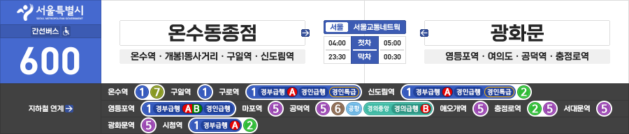 서울특별시 간선버스 서울교통네트웍 600번 (온수동종점.오류동삼거리 ↔ 공덕역.충정로역.광화문)