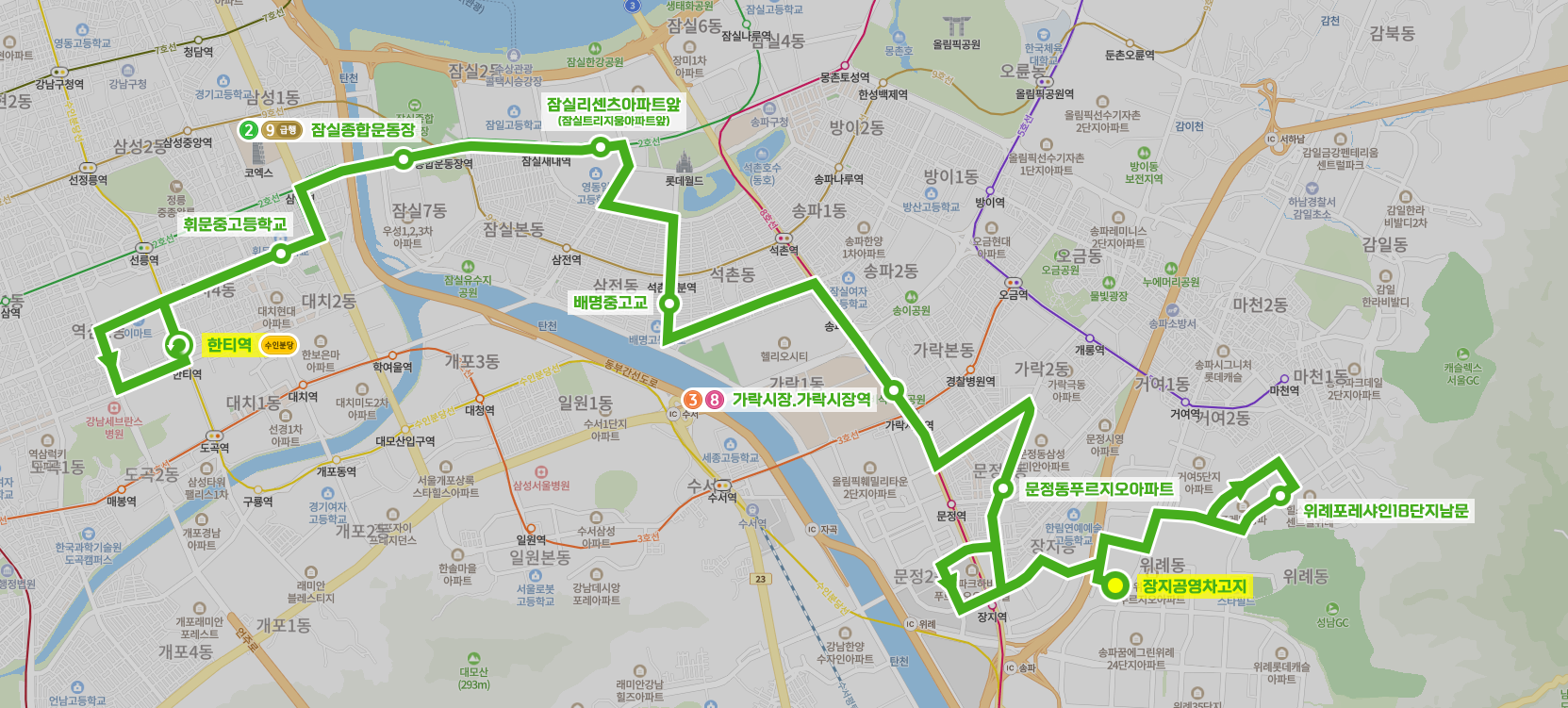 ◼ 상세 경유지 : 장지공영차고지 ↔ (위례포레샤인13단지 → 호반써밋송파2차 → 호반써밋송파2차정문 → 덕수고등학교 → 포레나송파정문 → 위례포레샤인18단지남문 → 포레나송파 → 포레나송파후문 → 위례포레샤인15단지 → 호반써밋송파1차 → 위례포레샤인13단지 → 위례포레샤인13단지공원) ↔ 아이코리아 ↔ 송파글마루도서관.버들어린이집 ↔ 문현고등학교.송파파인타운5단지 ↔ 상문현중학교 → 건영아파트 | 하장지역가든파이브라이프동 ↔ 문덕초등학교.문정고등학교 ↔ 문정동푸르지오아파트상 | 문정동대우아파트하 ↔ 문정래미안현대아파트앞 ↔ 가락동미륭아파트상 | 문정현대아파트하 ↔ 문정1동주민센터.로데오거리 ↔ 문정로데오거리입구상 ↔ 가락시장.가락시장역 ↔ 송파역상 | 송파역.헬리오시티하 ↔ 송파사거리.석촌시장 ↔ 송파책박물관.헬리오시티 ↔ 석촌동남현교회앞 ↔ 배명중고교 ↔ 삼학사길사거리 ↔ 잠실119안전센터 ↔ 영동일고레이크팰리스앞상 | 영동일고트리지움APT정문앞하 ↔ 잠실트리지움하 ↔ 잠실리센츠아파트앞상 | 잠실트리지움아파트앞하 ↔ 잠실새내역.잠실2동주민센터상 ↔ 잠실엘스아파트앞상 | 잠실새내역4번출구하 ↔ 종합운동장사거리 ↔ 잠실종합운동장 ↔ 강남경찰서.강남운전면허시험장하 ↔ 삼성역 ↔ 휘문중고등학교 ↔ 영동농협풍림아이원아파트 ↔ 도성초교사거리 ↔ (역삼e-편한세상아파트 → 한티역⟲ → 한티역7번출구 → 역삼중학교.강남세브란스병원 → 역삼2동주민센터.대림역삼아파트 → 역삼동개나리아파트) 이하 역순