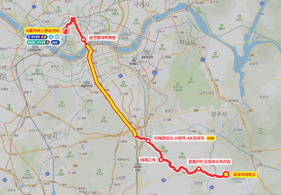 ◼ 상세 경유지 : 외국어대학교 ↔ 외대도서관앞하 ↔ 외국어대학교기숙사 ↔ 외대.모현빌라상 | 모현지석묘입구하 ↔ 외국어대입구 ↔ 외대사거리.왕산교 ↔ 신안아파트 ↔ 하마산.불영사 ↔ 모현초등학교 ↔ 매산사거리 ↔ 문형2리.오포하수처리장 ↔ 문형삼거리 ↔ 문형2리.영진빌라 ↔ 문형리잣나무골 ↔ 문형4리.수렁개 ↔ 문형3리되치미 ↔ 동서울공업사.시안정문 ↔ 오포장례식장.주성엔지니어링 ↔ 시안.엘리시움 ↔ 인성가스충전소 ↔ 능평리회전교차로 ↔ 능골삼거리상 | 능골마을앞하 ↔ 오포베르빌아파트 ↔ 글로비스자동차경매장하 ↔ 능평성당하 ↔ 창뜰마을입구.한토이 ↔ 능평복합문화센터.창뜰.장군수산 ↔ 수레실.오포롯데캐슬 ↔ 용상골현대아파트 ↔ 능평4리.119안전센터 ↔ 광명초등학교 ↔ 신현3리.오포마트 ↔ 현대모닝사이드1차아파트.새마을입구.신현리 ↔ 율동공원라폴리움상 ↔ 태재고개 ↔ 분당요한성당하 ↔ 건영빌라.분당요한성당.장안중학교상 | 장안중학교후문하 ↔ 율동공원 ↔ 장안타운입구.한신빌라 ↔ 임광아파트정문.효자촌입구.분당중앙교회 ↔ 서현중학교 ↔ 새마을연수원입구 ↔ 이매촌한신.서현역.AK프라자 ↔ 백현마을2단지상 | 백현마을3단지하 ↔ 백현마을1단지상 | 백현마을4단지하 ↔ 판교역.낙생육교.현대백화점 ↔ 고속도로 무정차 ↔ 순천향대학병원 ↔ 남대문세무서.국가인권위원회상 | 남대문세무서.서울백병원(중)하 ↔ 상종로2가사거리(중) → 을지로입구역.광교 | 하명동입구 ↔ 북창동.남대문시장상 | 숭례문하 ↔ 서울역버스환승센터⟲ 이하 역순