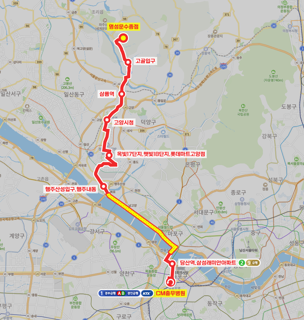 ◼ 상세 경유지 : 명성운수종점 ↔ 신성슈퍼앞 ↔ 내유동 ↔ 중간내유동 ↔ 윗내유동.희망양로원 ↔ 내유초등학교 ↔ 서울시립고양병원입구 ↔ 고골입구 ↔ 가장동 ↔ 두포동.관산동성당 ↔ 벽제교.관산삼거리 ↔ 벽제교삼거리 ↔ 쥬쥬테마동물원 ↔ 청대골 ↔ 삼릉역 ↔ 왕릉골 ↔ 부대앞 ↔ 윗배다리 ↔ 원릉역 ↔ 주교동.원릉방앗간상 ↔ 고양시청.주교동.덕양구보건소치매안심센터 ↔ 성사2동행정복지센터 ↔ 고양어울림누리.달빛마을1단지 ↔ 화정1동행정복지센터 ↔ 명지병원.달빛마을3단지 ↔ 화정동단독주택단지 ↔ 화정역.덕양구청 ↔ 별빛마을8단지.롯데마트상 | 화정역.롯데마트하 ↔ 근린공원 ↔ 화정2동행정복지센터 ↔ 옥빛17단지.롯데마트고양점상 | 햇빛18단지.롯데마트고양점하 ↔ 행신초등학교 ↔ 샘터마을2단지상 | 햇빛마을23단지하 ↔ 가라뫼.한전앞 ↔ 소만초등학교.소만마을8단지하 ↔ 무원고교 ↔ 행신SK뷰아파트상 ↔ 행신동삼거리.무원마을10단지 ↔ 토당초등학교.우창프라자 ↔ 능곡화원 ↔ 맨돌 ↔ 행주산성입구.행주내동 ↔ 고속도로 무정차 ↔ 당산역.삼성래미안아파트 ↔ 삼환아파트상 | 당산푸르지오아파트하 ↔ 영등포시장 ↔ CM충무병원⟲ 이하 역순