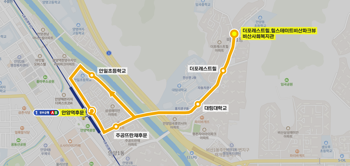 ◼ 상세 경유지 : 더포레스트힐.힐스테이트비산파크뷰.비산사회복지관 ↔ 더포레스트힐 ↔ 평촌자이아이파크3문.양성교회하 ↔ 대림대학교 ↔ (안일초등학교 → 안양역후문⟲ → 주공뜨란채후문) 이하 역순