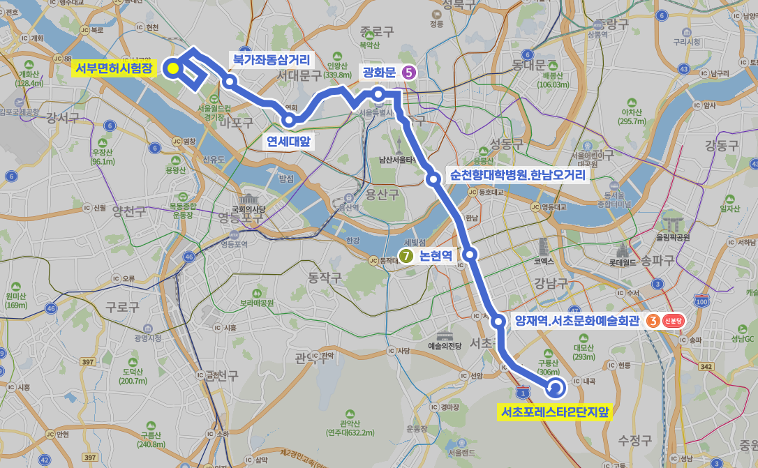 ◼ 첫차 : 서부면허시험장 - 04:00 | 서초포레스타2단지앞 - 05:45