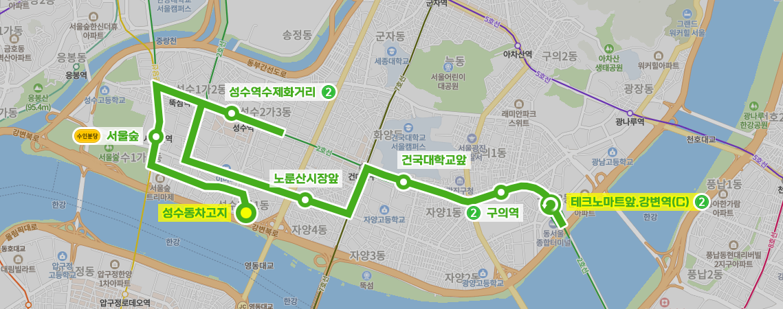 ◼ 상세 경유지 : 성수동차고지 ↔ 뚝도시장구길 ↔ 서울숲지구대앞 ↔ 성수1가새마을금고 ↔ 천주교성수동성당앞 ↔ 뚝도아리수정수센터수도박물관 ↔ 서울숲 ↔ 성동구민종합체육센터 ↔ 뚝섬역8번출구상 | 뚝섬역2번출구하 ↔ 뚝섬역3번5번출구상 | 뚝섬역4번출구하 ↔ 성수역 ↔ 성수동SK아파트형공장앞 ↔ 경동초등학교입구 ↔ 경일초등학교앞 ↔ 성수공고앞 ↔ 성원중성수동이마트앞 ↔ 뚝도시장 ↔ 경수중학교 ↔ 성수119안전센터 ↔ 노룬산시장앞 ↔ 국민은행신자양지점 ↔ 뚝도변전소앞상 | 대동아파트앞하 ↔ 건대역 ↔ 건국대학교앞 ↔ 자양초등학교앞 ↔ 자양사거리 ↔ 구의역3번출구상 | 구의역2번출구하 ↔ 광진우체국상 ↔ 테크노마트앞.강변역⟲ 이하 역순