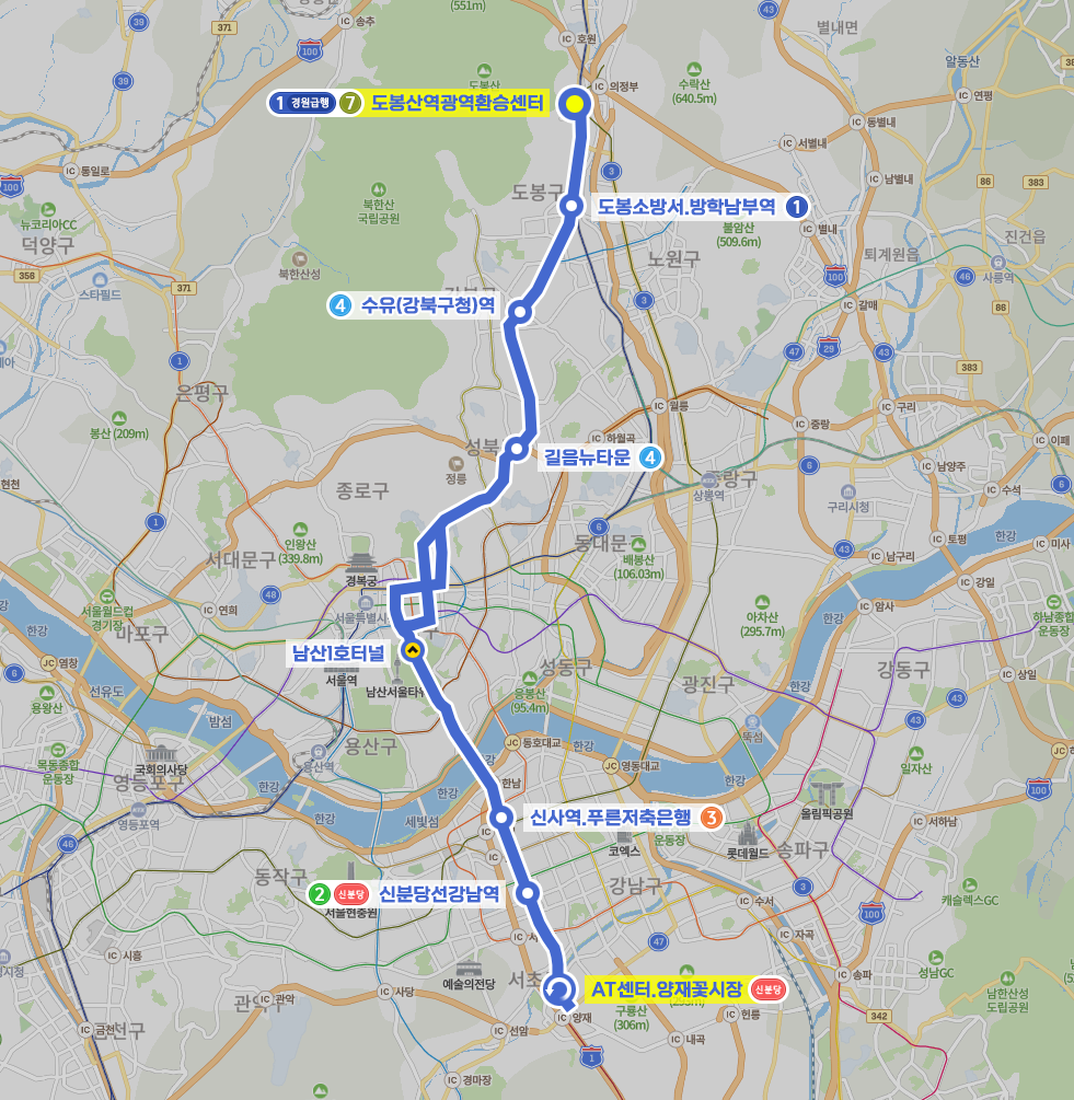 ◼ 막차 : 도봉산역광역환승센터 - 22:50 | AT센터.양재꽃시장 - 00:20