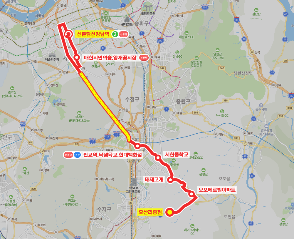 ◼ 상세 경유지 : 오산리종점 ↔ 하나이스골프장.희창냉장 → 다솔농장 ↔ 오산리.천주교묘지입구 ↔ 쌍용자동차.한국물류 ↔ 대교주유소 ↔ 능원리하 ↔ 레이크사이드골프장 ↔ 능원초.정몽주선생묘역입구 ↔ 능평교.고려바른정형외과 ↔ 오포베르빌아파트 ↔ 글로비스자동차경매장하 ↔ 능평성당하 ↔ 창뜰마을입구.한토이 ↔ 능평복합문화센터.창뜰.장군수산 ↔ 수레실.오포롯데캐슬 ↔ 용상골현대아파트 ↔ 능평4리.119안전센터 ↔ 광명초등학교 ↔ 신현3리.오포마트 ↔ 현대모닝사이드1차아파트.새마을입구.신현리 ↔ 태재고개 ↔ 분당요한성당하 ↔ 건영빌라.분당요한성당.장안중학교상 | 장안중학교후문하 ↔ 율동공원 ↔ 장안타운입구.한신빌라 ↔ 임광아파트정문.효자촌입구.분당중앙교회 ↔ 서현중학교 ↔ 새마을연수원입구 ↔ 이매촌한신.서현역.AK프라자 ↔ 백현마을2단지상 | 백현마을3단지하 ↔ 백현마을1단지상 | 백현마을4단지하 ↔ 판교역.낙생육교.현대백화점 ↔ 고속도로 무정차 ↔ (KCC사옥 → 지하철2호선강남역(중) → 신분당선강남역(중)⟲ → 래미안아파트.파이낸셜뉴스(중) → 뱅뱅사거리(중) → 양재역.서초문화예술회관(중) → 교육개발원입구(중) → 매헌시민의숲.양재꽃시장) 이하 역순