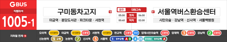 성남/서울시 직행좌석버스 대원고속 1005-1번 (구미동차고지.오리역 ↔ 서울백병원.서울역버스환승센터)