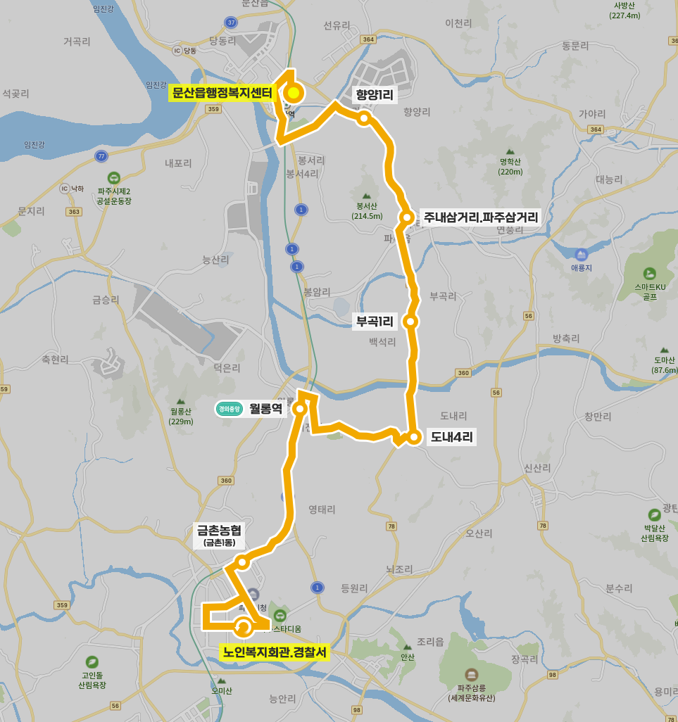 ◼ 상세 경유지 : 문산읍행정복지센터 ↔ 북파주농협.구문산터미널상 | 문산타워.구문산터미널하 ↔ 한진1차.문산역 ↔ 통일공원 ↔ 봉서3리 ↔ 문산수억중고등학교 ↔ 향양1리 ↔ 향양2리 ↔ 현인농원 ↔ 낙석부대 ↔ 범일금고 ↔ 주내삼거리.파주삼거리 ↔ 주내방앗간 ↔ 주내방앗간 ↔ 부곡1리 ↔ 부곡리 ↔ 백석1리마을회관 ↔ 도내3리 ↔ 4리.도내2 ↔ 도내1리 ↔ 위전리 ↔ 금강산랜드 ↔ 위전리 ↔ 월롱역 ↔ 위전3리.신성레미콘 ↔ 영태1리 ↔ 영태5리 ↔ 파주여고.광일중 ↔ 순복음평화교회 ↔ 금촌농협상 | 금촌1동하 ↔ 금촌역 ↔ 금촌통일시장하 ↔ 금촌사거리 ↔ 장안아파트 ↔ (KT파주지사 → 대하마트 → 금화초교1단지 → 후곡마을4단지 → 쇠재마을5단지 → 노인복지회관.경찰서⟲ → 흰돌아파트 → 한국전력 → 파주시청) 이하 역순