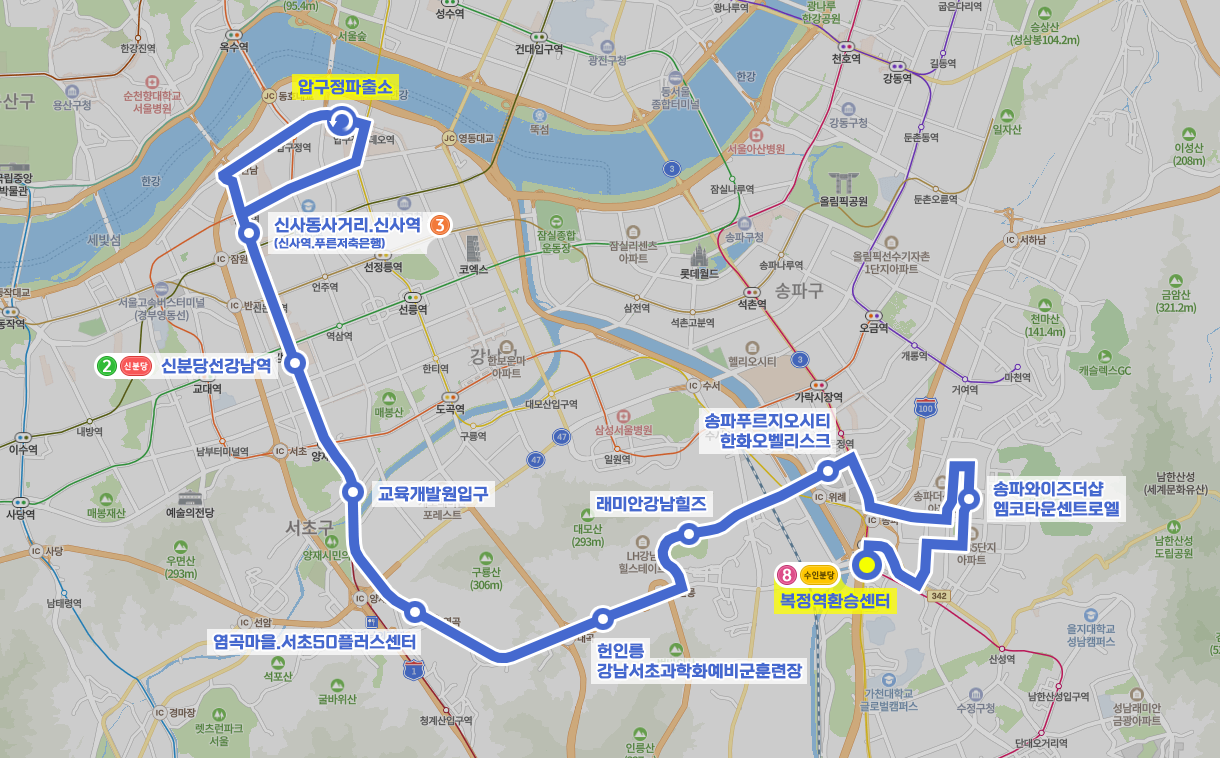 → 복정역환승센터에서 탑승하실 때에는 압구정 방면 4번 정류소, 하차 시 2번 정류소에서 이용하시기 바랍니다.