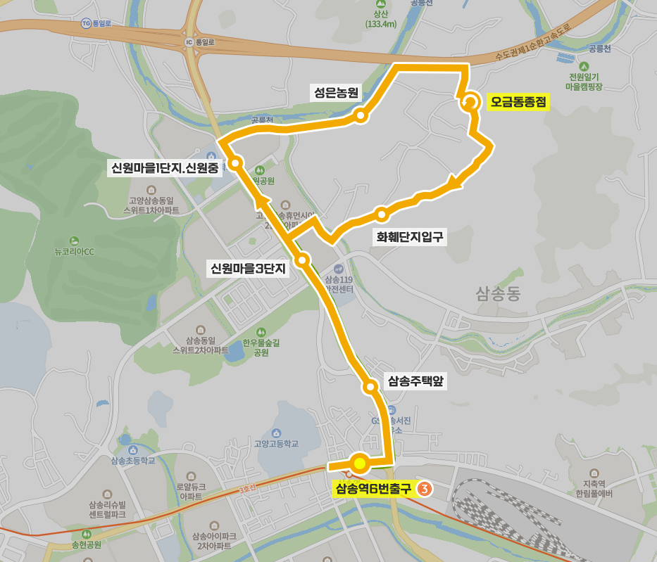 ◼ 상세 경유지 : 삼송역6번출구 ↔ 삼송역사거리.지축차량기지입구 ↔ 삼송주택앞 ↔ 신원마을3단지 ↔ (신원마을2.4단지 → 신원마을1단지.신원중 → 우림아파트후문 → 성은농원 → 고양아쿠아특수촬영스튜디오 → 오금동종점⟲ → 마을회관 → 화훼단지입구 → 신원마을3단지후문 → 신원마을2단지정문) 이하 역순