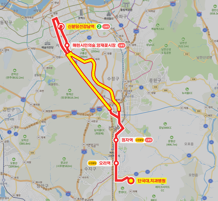 ◼ 상세 경유지 : 단국대.치과병원 ↔ 단국대정문상 ↔ 대지고등학교.전내교차로 ↔ 꽃메마을1단지상 | 꽃메마을2단지하 ↔ 꽃메마을.새에덴교회상 ↔ 꽃메마을.현대홈타운3단지상 ↔ 중앙공원 ↔ 보정동주민센터 ↔ 보정동카페거리.죽현마을상 ↔ 죽전초중고교.대현초교 ↔ 농수산물센터 ↔ 오리역 ↔ 하얀마을.구미도서관 ↔ 까치마을.건영빌라.2001아울렛 ↔ 미금역.청솔마을.2001아울렛 ↔ 청솔주공6단지상 | 분당경영고.청솔중하 ↔ 상록마을(임광.보성).미켈란쉐르빌 ↔ 아데나펠리스 ↔ 정자역 ↔ 두산위브제니스상 | 정자청소년수련관.분당클리닉하 ↔ 느티마을.경남빌라상 | 로얄팰리스아파트하 ↔ 롯데백화점.수내역 ↔ 분당구청입구.수내교 ↔ 신백현초등학교상 ↔ 백현육교상 ↔ 판교역.낙생육교.현대백화점상 ↔ 고속도로 무정차 ↔ (KCC사옥 → 신논현역.유화빌딩 → 신분당선강남역(중)⟲ → 우성아파트(중) → 뱅뱅사거리(중) → 양재역.서초문화예술회관(중) → 교육개발원입구(중) → 매헌시민의숲.양재꽃시장) 이하 역순
