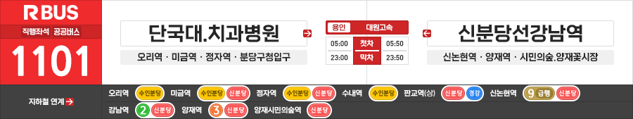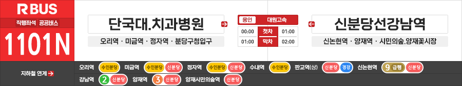 ◼ 첫차 : 단국대.치과병원 - 05:00(1101) 00:00(1101N) | 신분당선강남역(중) - 05:50(1101) 01:00(1101N)