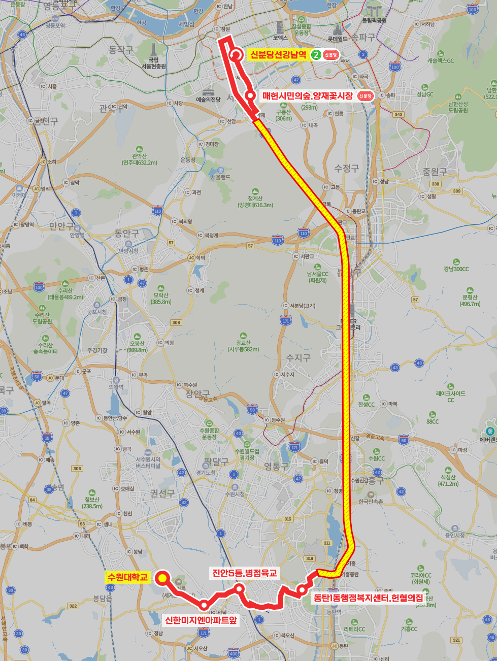 ◼ 상세 경유지 : 수원대학교 ↔ 융건릉사거리 ↔ 융건릉.용주사입구 ↔ 중외제약사거리 ↔ 신한미지엔아파트앞 ↔ 북촌말입구상 | 안녕동하 ↔ 송산동입구 ↔ 동문아파트상 | 안용중학교.현충탑하 ↔ 진안5통.병점육교 ↔ 병점역후문 ↔ 유엔아이 ↔ 한일타운아파트 ↔ 성호아파트 ↔ 우남퍼스트빌 ↔ 서동탄역.신일해피트리(중) ↔ 모아미래도.우림필유.평생학습관(중) ↔ 우림필유상 | 모아미래도하 ↔ 동탄고등학교 ↔ 숲속자연앤 ↔ 능동은행사거리상 | 자연앤아너스빌하 ↔ 센트럴파크 ↔ 금호어울림상 | 한화꿈에그린아파트하 ↔ 메타폴리스상 | 현대아이파크하 ↔ 동탄1동행정복지센터 ↔ 신일유토빌정문상 | 롯데캐슬정문하 ↔ 예당예원초 ↔ 전하리교회.우미제일 ↔ 이마트.한림대병원 ↔ 고속도로 무정차 ↔ (KCC사옥 → 신논현역.영신빌딩 → 신분당선강남역(중)⟲ → 우성아파트(중) → 뱅뱅사거리(중) → 양재역.서초문화예술회관(중) → 교육개발원입구(중) → 매헌시민의숲.양재꽃시장) 이하 역순