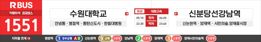 화성/서울시 직행좌석버스 대원고속 1551번 (수원대학교.병점역.동탄신도시 ↔ 신분당선강남역.양재역)