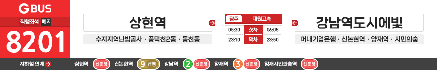 용인/서울시 간선급행버스 대원고속 8201번 (상현역.수지지역난방공사 ↔ 강남역도시에빛.시민의숲)